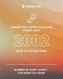 We’ve been matching puppies with their “fur-ever” homes since 2002. I guess you could say we’re 161 years old in dog years! That’s a lot of connections, nose boops, and puppy kisses, and we couldn’t be more proud of what we do. Whether you are listing your loving puppies on Puppies.com or searching for the perfect puppy, we are here when you need us.