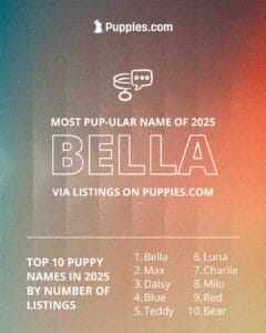 Drumroll, please! The most popular puppy name of 2025 was… Bella! For the 2nd year in a row, the name Bella topped all listings with this adorable name.
