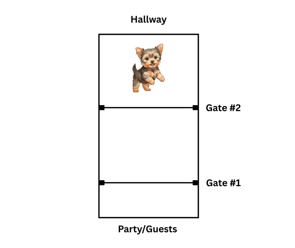 This can be easily accomplished by boarding the pup elsewhere for the night, keeping them in a quiet, separate room, or using a baby gate and a bunch of food toys to keep them away from guests. If you use the last option, our strong recommendation is to place two baby gates several feet apart down a hallway. Many guests can’t help but lean over the gates when they see a dog, even if you’ve told them your dog is nervous around people and asked them to leave your dog alone. This is an awful scenario, with your dog trapped in a room and someone leaning over a gate toward them. Instead, use two gates that are several feet apart. This ensures that your guests stop at the first gate, your dog is behind the second gate, comfortably far away from your guests who “love dogs,” and thus everyone’s safety is ensured.